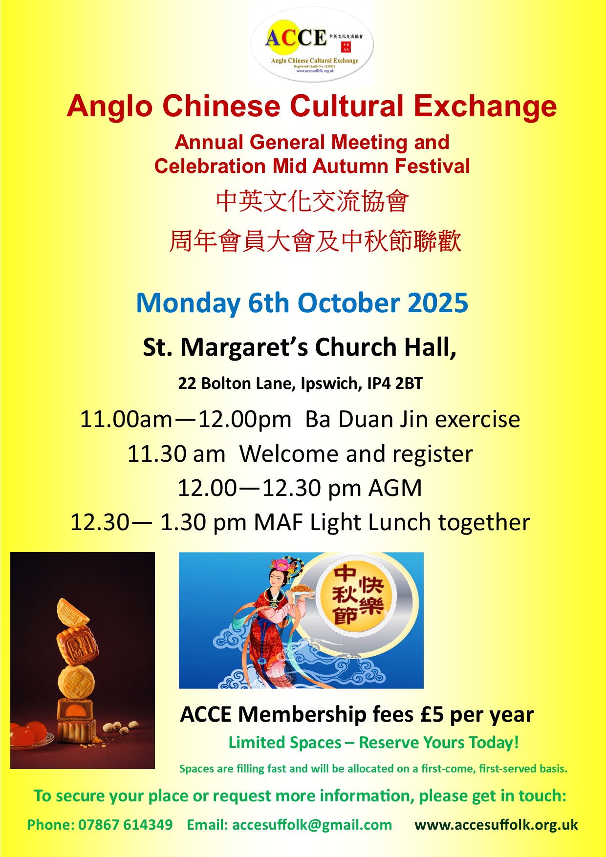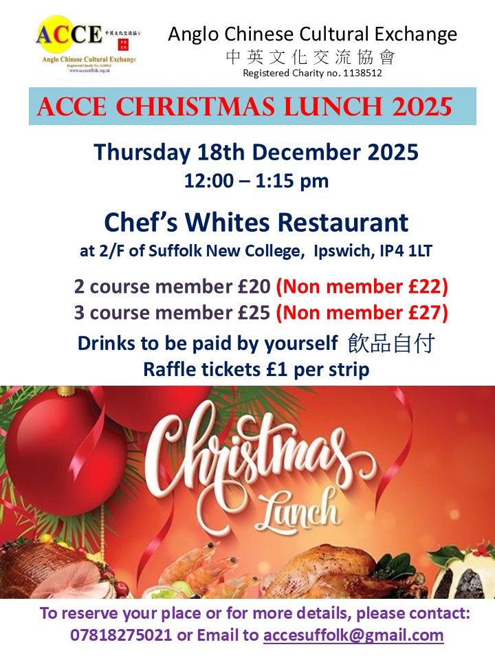 We have food, tea/coffee, game, Ba duan jin. People can also bring their own drink or their packed lunch to join us. Welcome all the new comer and Ipswich Local residence. Places are limited in first come first service. Please reserve your place by email to accesuffolk@gmail.com before 15 April 2023.